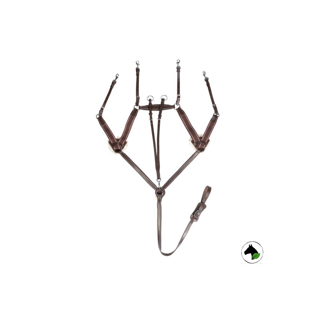 Kožený martingal s gumovou zarážkou a nerezovým kováním. Martingal je pomocná otěž s krožky, kterými se provléká otěž. V případě správného použití martingal zabraňuje koním zvedat vysoko hlavu a zmírňje působení otěží.