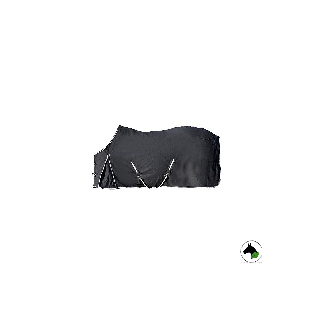 Atraktivní stájová deka s širokým proševem, dvojitým nastavitelným zapínáním na prsou na 2 přezky, rozparky na pleci pro volný pohyb koně, křížové zapínání pod břichem jako ochrana proti přetočení, nastavitelné popruhy mezi zadní nohy a chránič ocasu.