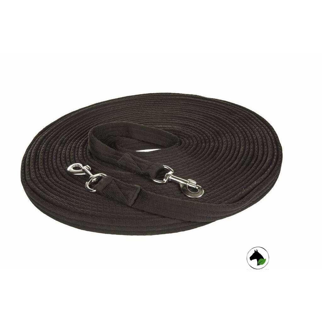 Dvojitá lonž Slim je ideální pomůckou pro efektivní lonžování a práci ze země. Je vyrobena z pevného popruhu, který zajišťuje spolehlivou manipulaci, a má celkovou délku 18 metrů. Lonž lze uprostřed rozepnout a je vybavena karabinami, což umožňuje všestranné použití. Konce jsou zakončeny kulatou nylonovou šňůrou pro plynulé a hladké vedení. V klasické černé barvě zaujme dvojitá lonž svou funkčností a dlouhou životností.