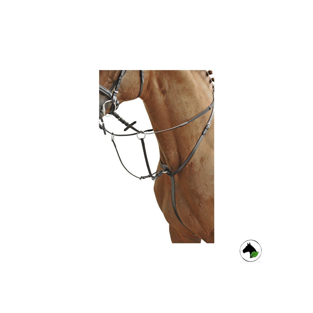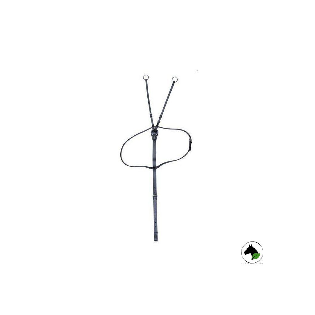 Kožený martingal s gumovou zarážkou a nerezovým kováním. Martingal je pomocná otěž s krožky, kterými se provléká otěž. V případě správného použití martingal zabraňuje koním zvedat vysoko hlavu a zmírňje působení otěží.