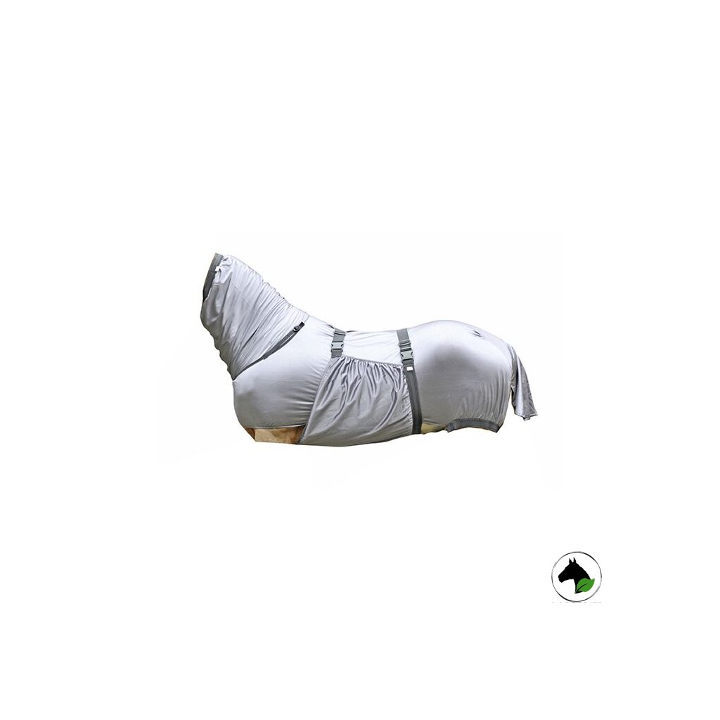 Lehká síťovaná deka proti hmyzu z měkkého polyesterového materiálu se zapínáním na přezky a suchým zipem na prsou, odnímatelným krkem, nastavitelným křížovým zapínáním pod břichem a chráničem ocasu.