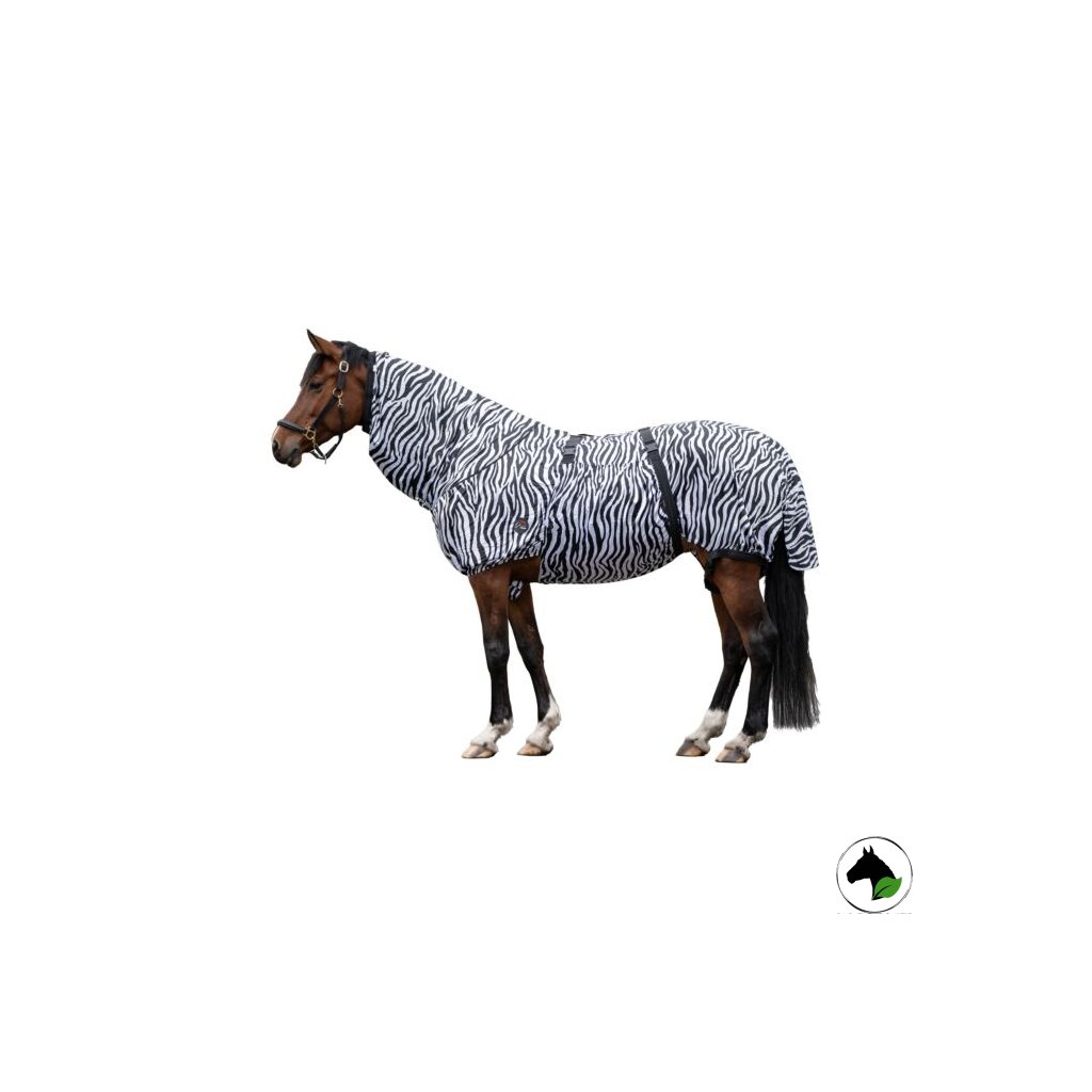 Lehká síťovaná deka proti hmyzu z měkkého polyesterového materiálu se zapínáním na přezky a suchým zipem na prsou, odnímatelným krkem, nastavitelným křížovým zapínáním pod břichem a chráničem ocasu.