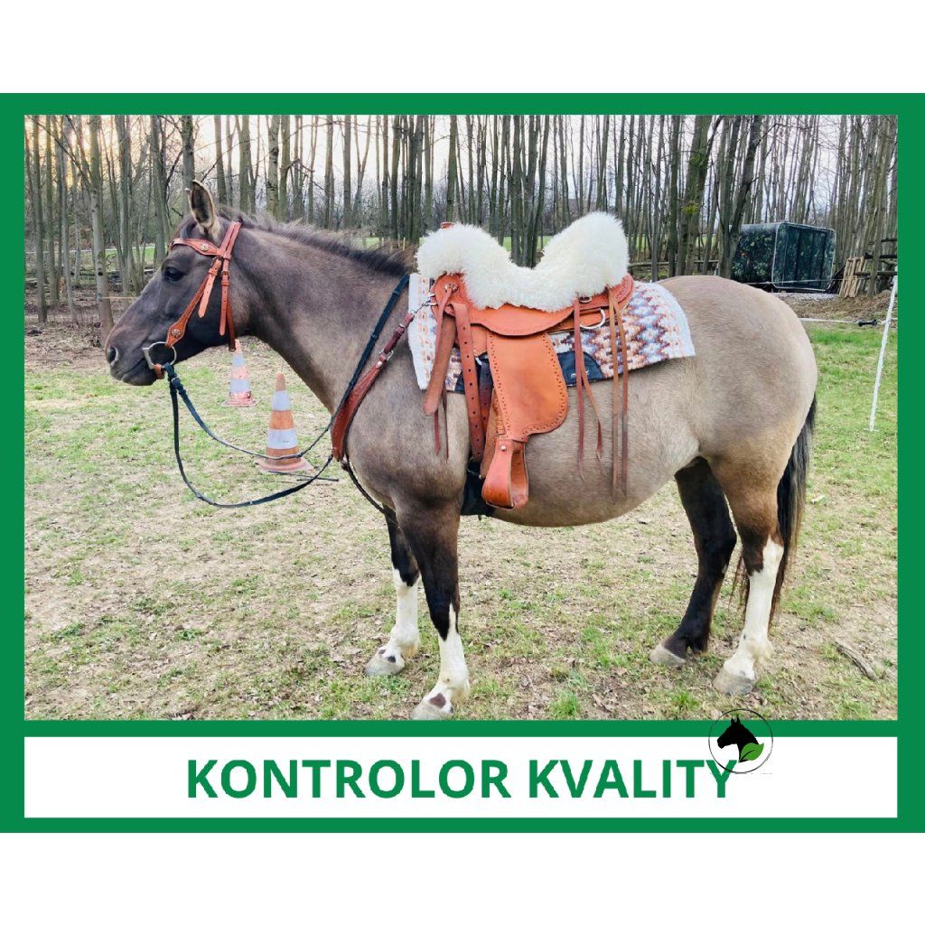 Kontrolorka kvality: 5 letá kobylka menšího vzrůstu, využívána na práci ze země a výlety do hor, sedlo má šité na míru a pod ním skvělou filcovou podsedlovku Classic equine, která výborně odvádí pot a skvěle tlumí případný tlak a nárazy.