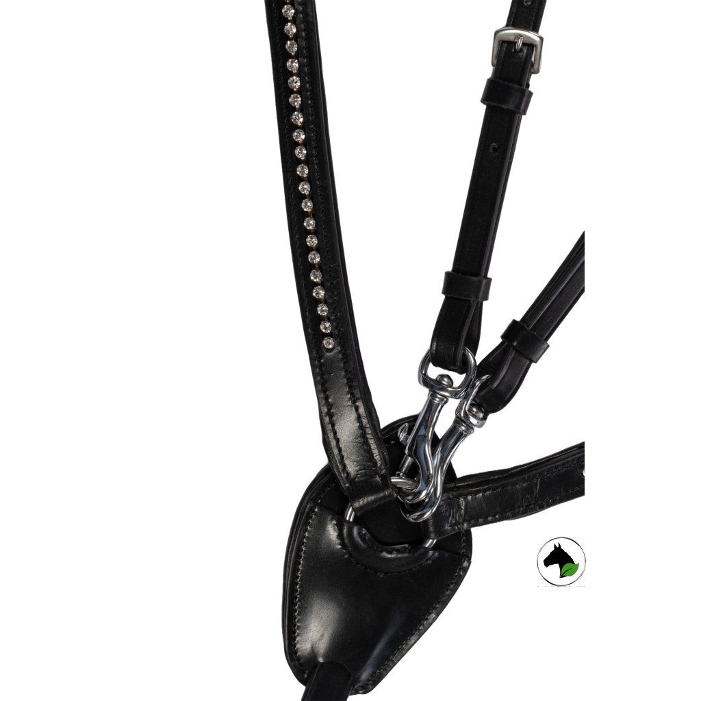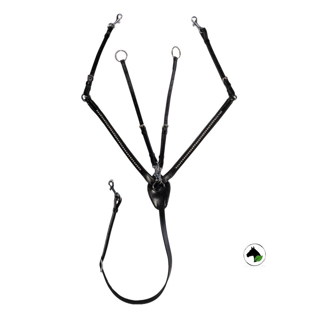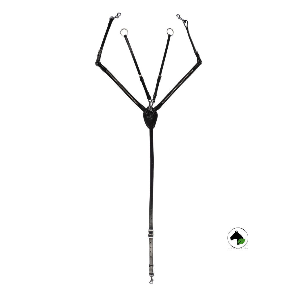 Kožený martingal s gumovou zarážkou a nerezovým kováním. Martingal je pomocná otěž s krožky, kterými se provléká otěž. V případě správného použití martingal zabraňuje koním zvedat vysoko hlavu a zmírňje působení otěží.