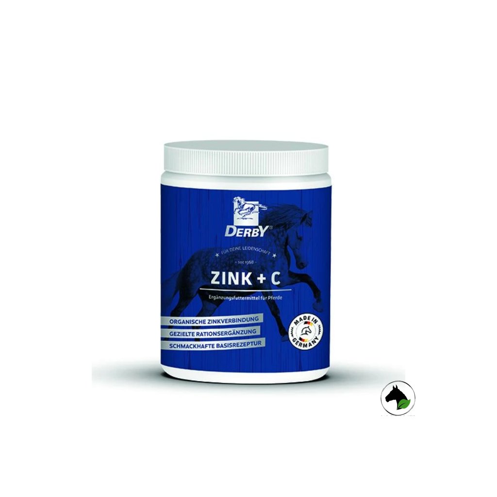 DERBY Zink + C je speciální doplněk krmiva pro všechny koně a poníky, u kterých je třeba kompenzovat nedostatek zinku související se stravou. DERBY Zinc + C nabízí organickou sloučeninu zinku v kombinaci s vitaminem C, který je velmi dobře absorbován metabolismem. Zinek je složkou více než 200 enzymů a jako kofaktor řídí důležité metabolické procesy, jako je endokrinní systém nebo imunitní systém. Vitamin C se obvykle vyrábí přirozeně a celoročně, ale cílené doplnění vitamínu C zajišťuje podporu imunitního systému v každé situaci. Mnohem důležitější je však podíl zinku na tvorbě nových buněk u mladých koní, ale také na obnově buněk u dospělých koní. Zde je metabolismus kůže a růst srsti na prvním viditelném místě.